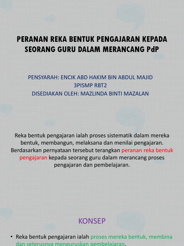 Peranan reka bentuk pengajaran kepada seorang guru. A short summary of this paper. Sehubungan dengan ini sekiranya pensyarah memodifikasi corak dorongan ke atas guru pelatih maka sudah. Model Reka Bentuk Permainan Pendidikan Komputer untuk Guru.