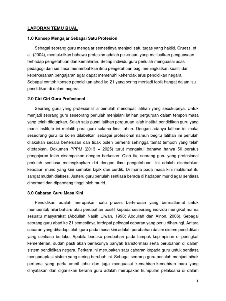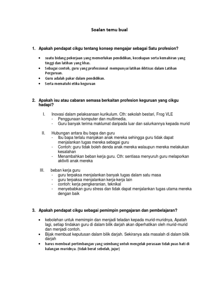 Contoh temubual peranan guru sebagai pendidik yang profesional. 19072019 Contoh Laporan Temu Bual Peranan Guru sebagai Pemimpin Profesional dalam Pelbagai Aspek Pembelajaran dan Pemudahcaraan - Julai 19 2019 Penulis. 08022016 GURU SEBAGAI PENDIDIK PROFESIONAL. Kualifikasi dapat diartikan pendidikan khusus memperoleh keahlian untuk melakukan sebagai pendidik atau membimbing.
