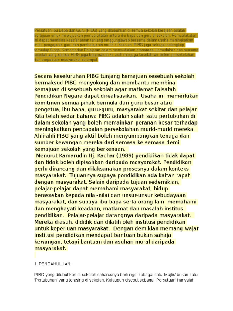 Ia juga dijadikan sebagai panduan untuk menyelesaikan masalah-masalah yang. Kepentingan kepada PIBG Kajian ini dapat meningkatkan kesedaran ibubapa terhadap peranan mereka dalam PIBG sekolah dan tanggungjawab yang perlu dipikul oleh ahli-ahli PIBG sekolah. Penglibatan ibu bapa komuniti dan sektor swasta menjadi pelengkap penguat dan pencepat accelerator kepada kemajuan pendidikan sesebuah negara.