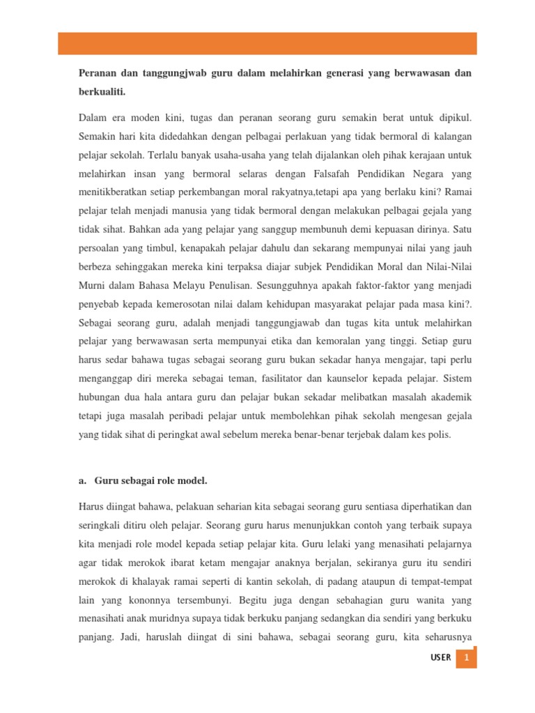 2017-03-29 Jadi jelaslah bahawa pihak sekolah dan guru memikul tanggungjawab yang agak signifikan dalam melahirkan pelajar yang bermoral dengan mengamalkan nilai murni. Melahirkan masyarakat pelajar yang bersatu padu dan bekerjasama serta memahami peranan mereka dalam aktiviti kemasyarakatan. 2017-12-09 Lantaran itu ibu bapa dan pihak sekolah memainkan peranan yang penting untuk mendidik remaja menjadi modal insan kelas pertama yang berakhlak mulia dan berjati diri unggul.