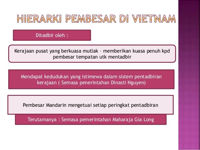 HIERARKI DAN PERANAN PEMBESAR DI VIETNAM SEBELUM. Huraikan konsep hierarki dan peranan pembesar di Vietnam pada abad ke-19. Melalui sistem tersebut raja atau maharaja bertindak sebagai ketua pemerintah tertinggi dalam negara menguasai ekonomi negaramenggubal undang-undang mengetuai angkatan tentera dan.