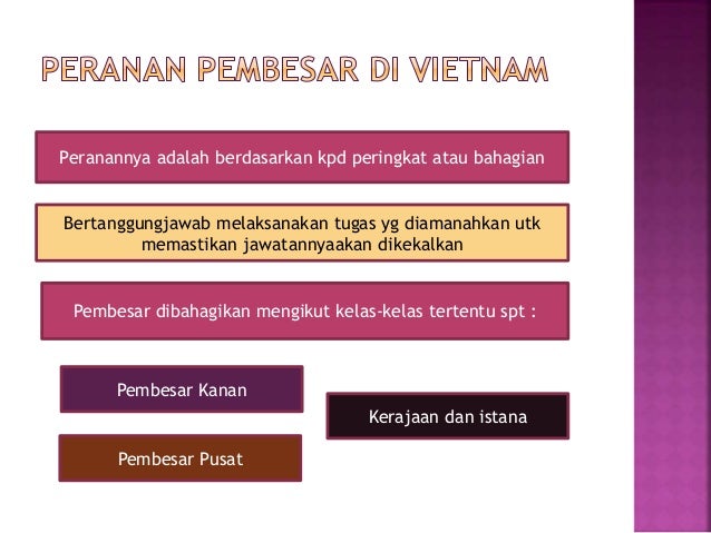 Wednesday 6 September 2017. Jelaskan peranan pembesar di Vietnam sebelum campur tangan kuasa Barat di negara mereka. Pembesar memainkan peranan penting membantu raja menguruskan pemerintahan negara dan berfungsi.