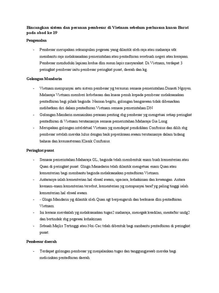 Bincangkan Sistem Dan Peranan Pembesar Di Vietnam Sebelum Perluasan Kuasa Barat Pada Abad Ke 19
