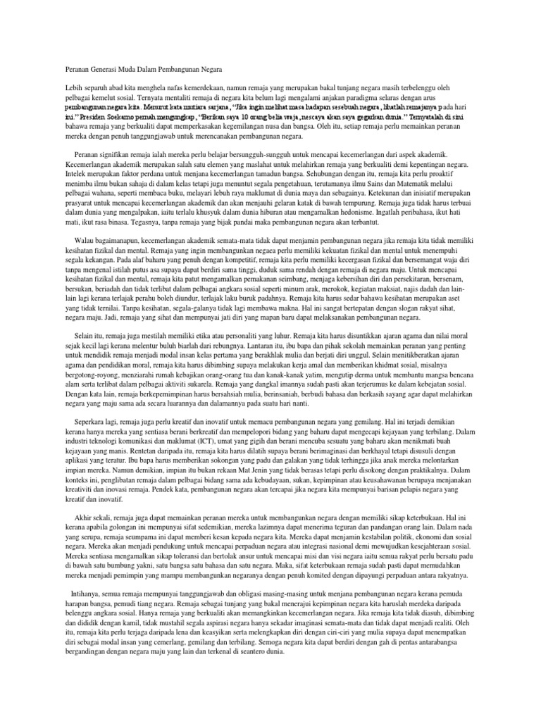 Resolusi konflik dan perdamaian menjadi unsur penting untuk. Unlabelled Contoh Karangan Peranan Remaja Dalam Pembangunan Negara. 18102017 Pendek kata pembangunan negara akan tercapai jika negara kita mempunyai barisan pelapis negara yang kreatif dan inovatif.