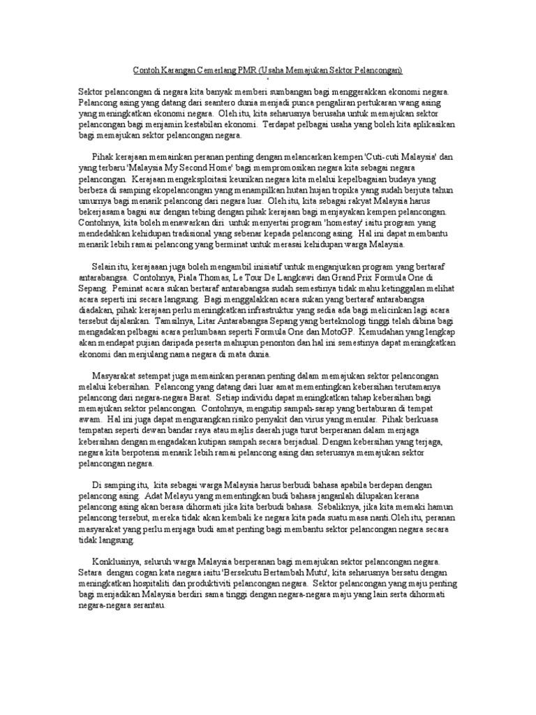 507 PM Contoh Karangan SPM Karangan SPM Karangan SPM Bahagian B Usaha memajukan sektor pelancongan Malaysia. Kita sebagai ahli masyarakat haruslah bersama-sama untuk menghadapi segala cabaran masa depan bagi menjanjikan sektor pelancongan sebagai tulang ekonomi di negara kita. Apabila kerajaan mula mengisytiharkan Tahun Melawat Malaysia pada tahun 1990 usaha ini menunjukkan bahawa kerajaan semakin memberikan perhatian yang serius kepada industri.